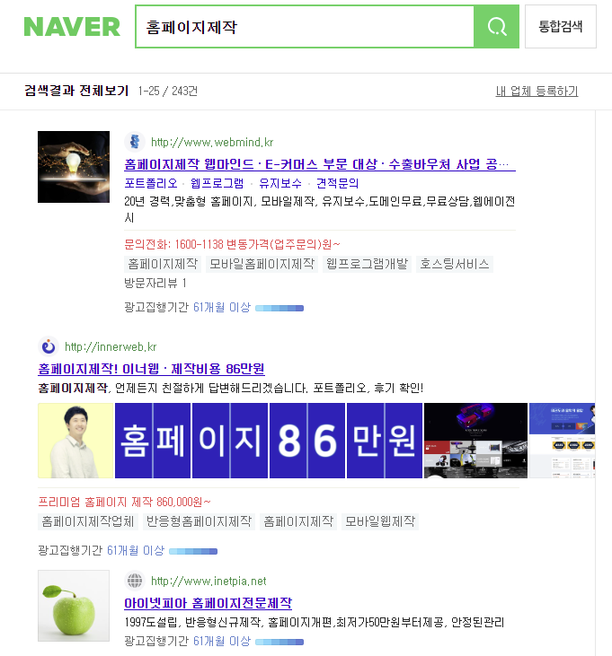 이렇게 네이버에 검색만 해도 여러 홈페이지 업체가 나오는데요.